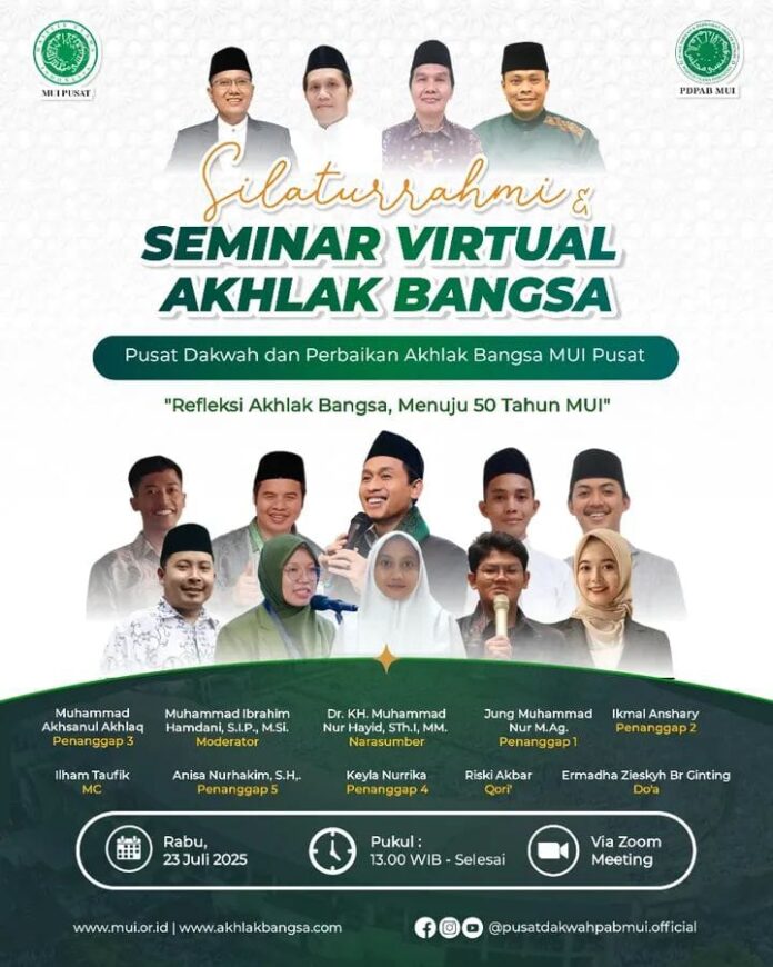 NEWSCOM.ID, JAKARTA – Pusat Dakwah dan Perbaikan Akhlak Bangsa (PD PAB) Majelis Ulama Indonesia (MUI) berkomitmen kuat untuk fokus meningkatkan kualitas fondasi akhlak bangsa di kalangan generasi muda Muslim Indonesia, khususnya generasi milenial (Gen Y) dan zilenial (Gen Z). Aplikasi kebijakan ini dilaksanakan PD PAB dengan metode kombinasi seminar tematik akhlak bangsa dengan teknologi media sosial dan telekonferensi (konferensi jarak jauh) seperi Zoom Cloud Meeting. Tepatnya, dalam rangkaian acara “Seminar Virtual dan Silaturahmi Akhlak Bangsa”.
