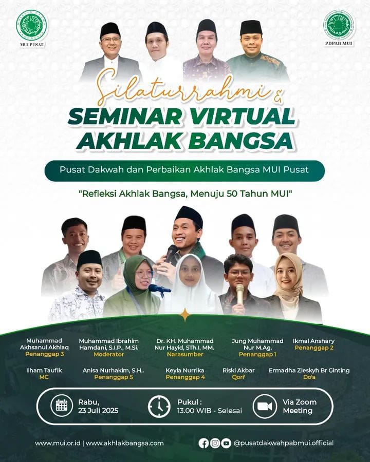 Tema menarik lainnya yang dibahas dalam rangkaian kegiatan Seminar Virtual dan Silaturahmi Akhlak Bangsa ialah “Refleksi Akhlak Bangsa, Menuju 50 Tahun MUI,” yang berlangsung pada Rabu (23/07/25) siang, Pukul 13.00 WIB hingga Pukul 15.30 WIB. Adapun narasumber dalam seminar ini ialah Pengurus PD PAB MUI, KH. Dr. Muhammad Nur Hayyid, S.Th.I., M.M., yang juga Anggota Badan Nasional Sertifikasi Profesi (BNSP) Republik Indonesia (RI).